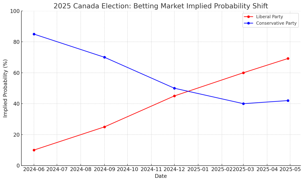 In January 2025, the Conservatives were listed at odds of -2000 to win — implying over a 95% chance of victory. Now, they find themselves significant underdogs. This is not merely a slip; it is one of the most dramatic implosions of a favored party in Canadian election history.